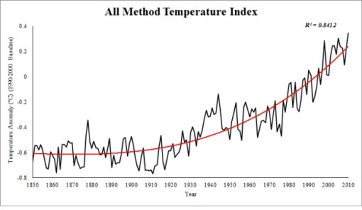 The graph below comes from: http://www.skepticalscience.com/Ten-temperature-records-in-a-single-graphic.html and it represents the average of ten different climate records maintained by different organisations around the world