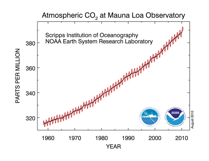 The twin graphs above show that the level of CO2 in the atmosphere has not exceeded 300 ppm for 800 000 years – until now, when it has risen rapidly in the past 100 or so years to reach 390 ppmv.
