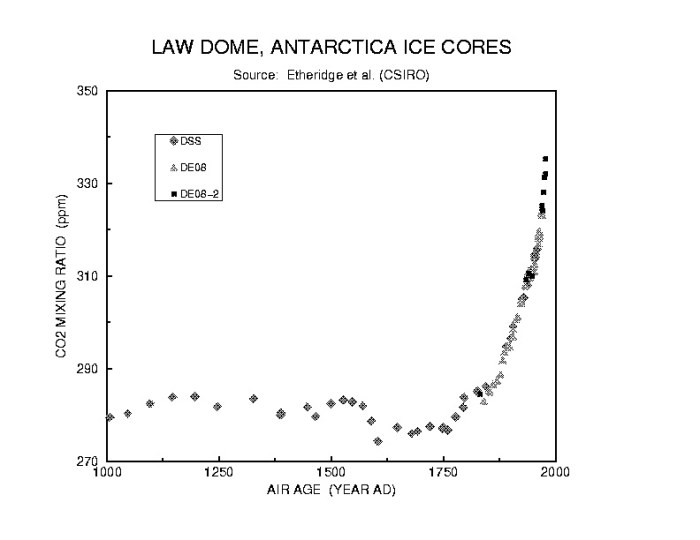 The graph above shows that the amount of CO2 in the atmosphere only began to climb when land clearing and the industrial revolution got under way in 1750. (By the way, this graph is out of date; the current level of CO2 in the atmosphere is 390 ppm. Put your finger at 390 on the left hand axis to see what is happening).