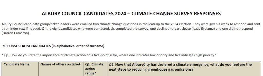 Albury Council candidates were emailed two climate change questions by WATCH in the lead up to the 14 September 2024 election.