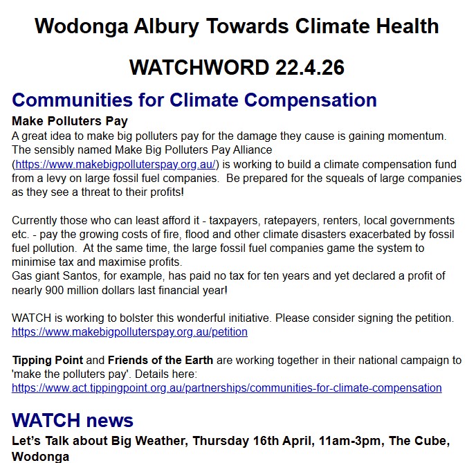 As always, this edition of WATCHWORD is full of information and links about local and national climate change issues, as well as the events and activities of local environment and sustainability community groups.