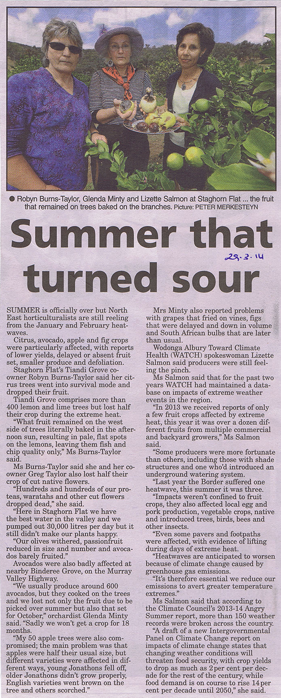 Since January 2013 WATCH has maintained a database of the impacts of extreme weather events (i.e. heatwaves and warmwaves) on crops, livestock, other flora and fauna, human health and infrastructure in Albury-Wodonga and surrounds.